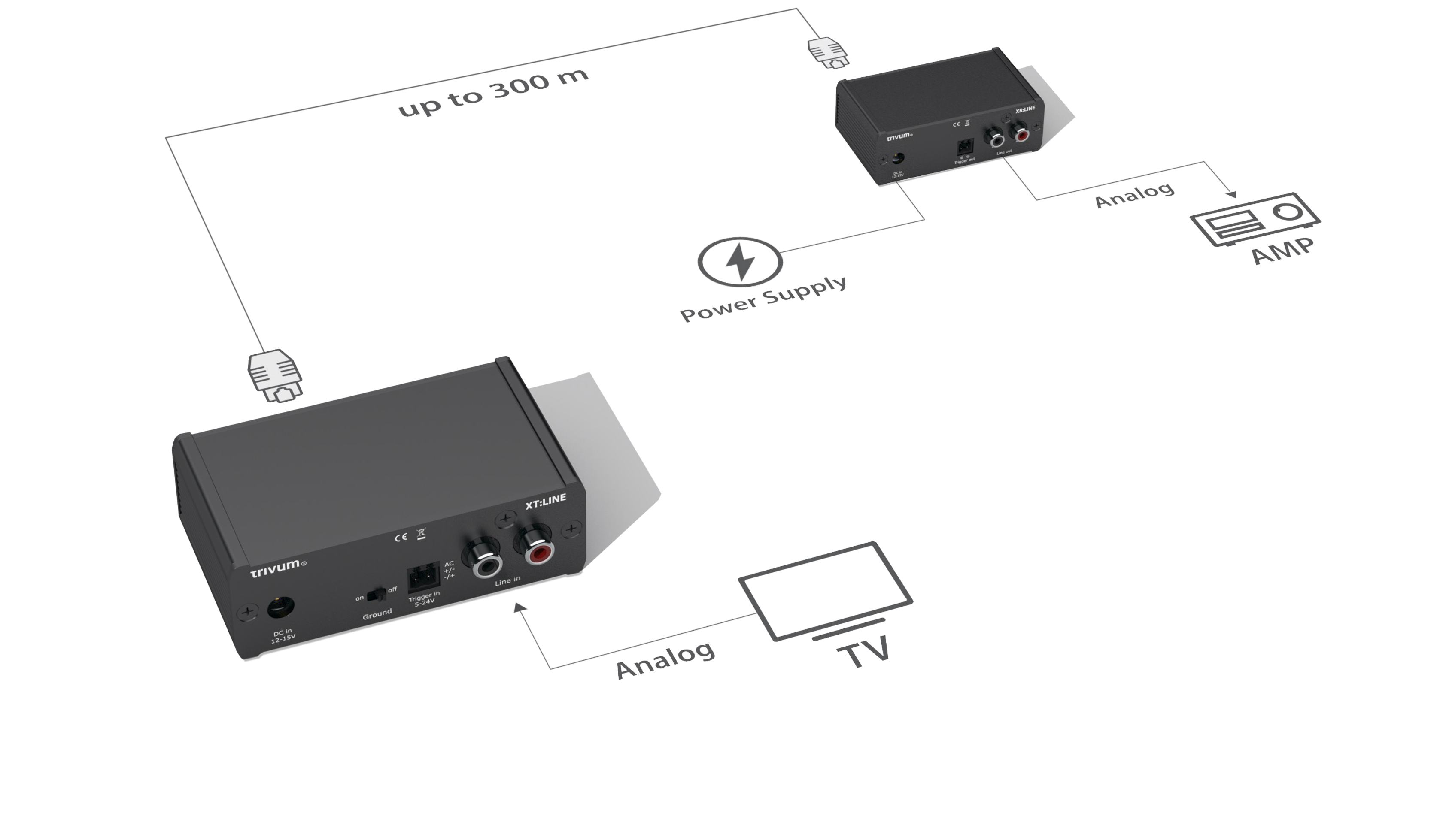I dispositivi audio extender di trivum sono soluzioni professionali per la trasmissione di segnali audio su lunghe distanze utilizzando cavi di rete standard.